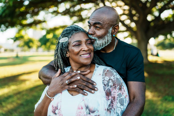Senior man affectionately embraces his wife and gives her a kiss on the forehead while enjoying a relaxing afternoon walk through a park.