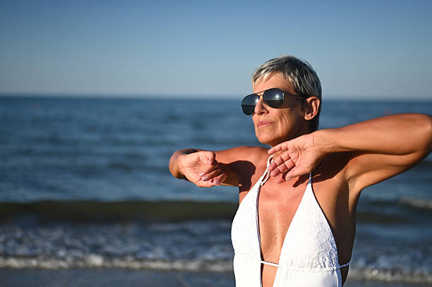 Mature woman wearing sunglasses and a white swimsuit stretching her arms on the beach