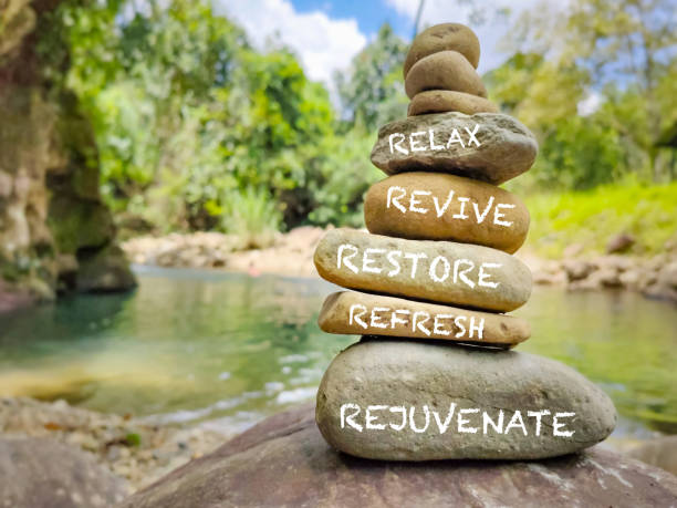 Relax, revive, restore, refresh and rejuvenate text written on pebbles stack with nature background