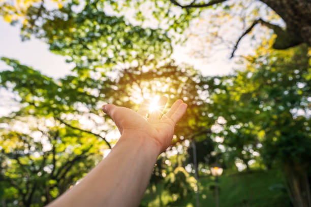 Photo of a hand reaching for the sunrise above the trees in the morning