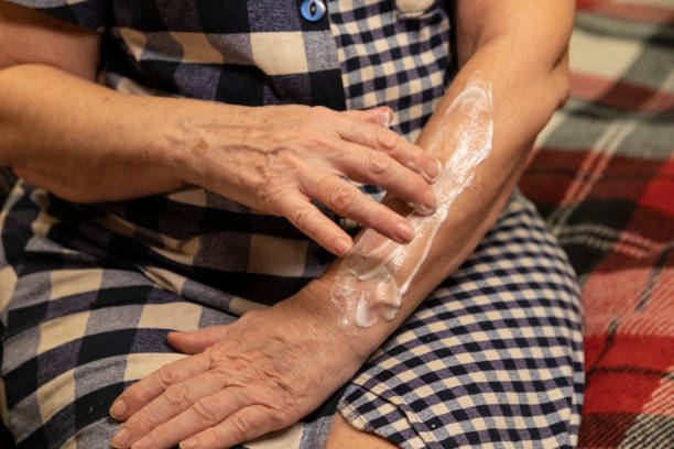 Elder applying moisturizer to help dry skin