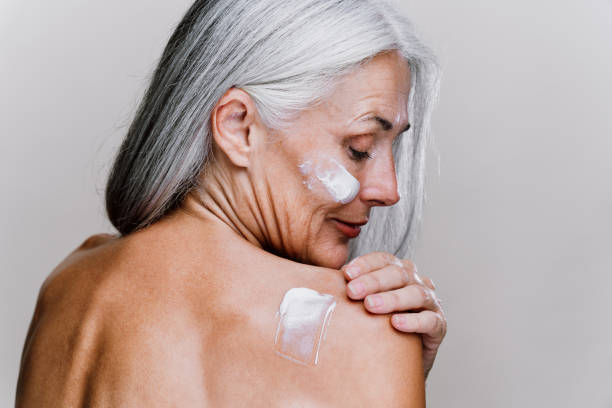 Senior woman applying cream to moisturize her skin. Concept is body positivity, self-esteem and body acceptance