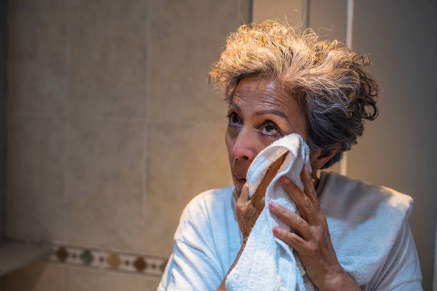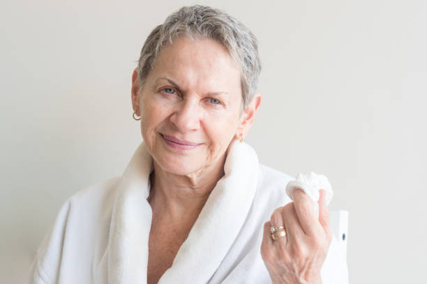 Senior woman in white bathrobe holding facial tissue