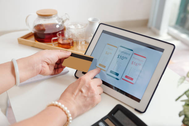 Hands of senior woman choosing subscription or payment plan on tablet computer and paying with credit card